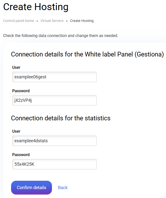 Connection data for the new hosting -The user and password of the various services will automatically be generated, modified by those you wish.