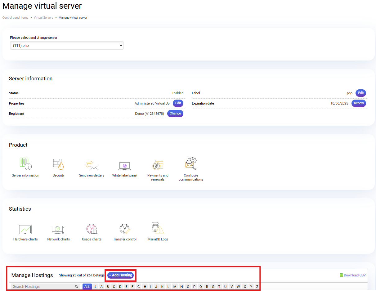 Once on the "Manage Virtual Server" screen, click the option +Add Hosting, which will open a form allowing you to create the web hosting while distributing the available resources.