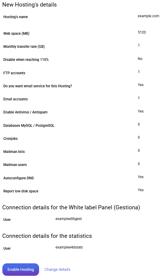 - Connection data for the White Label Gestiona panel: Connection data for the web hosting control panel. This panel is white-label and accessed via www.hosted-domain.com/pcontrol.