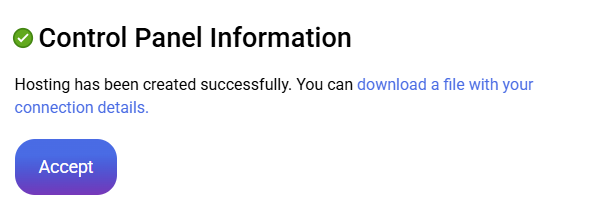 A window like the following will appear to confirm the hosting registration. From here, you can download a CSV with the connection data (only usernames are shown; passwords are hidden for security).