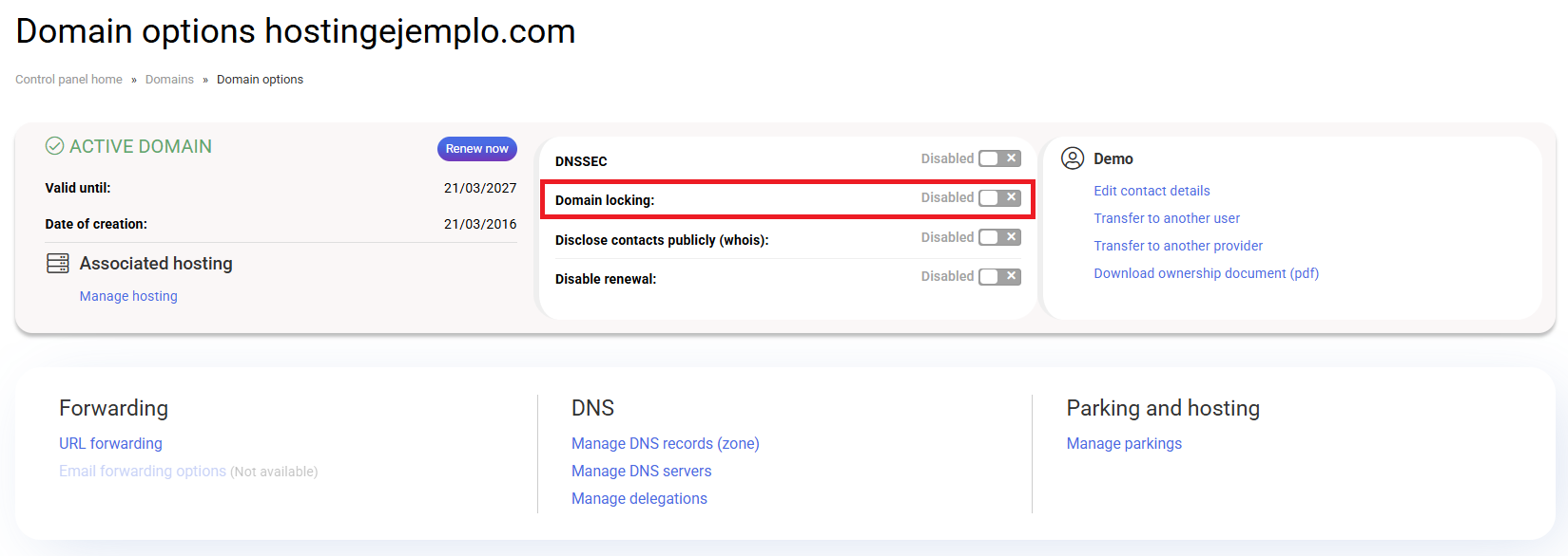 On the domain management screen you can block or unlock your domain by clicking on the option Domain blockade.