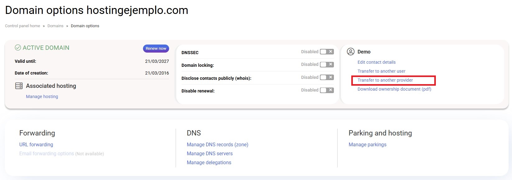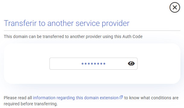 Within the management of a domain, to request the AUTH CODE, click on the option Transfer to another supplier.