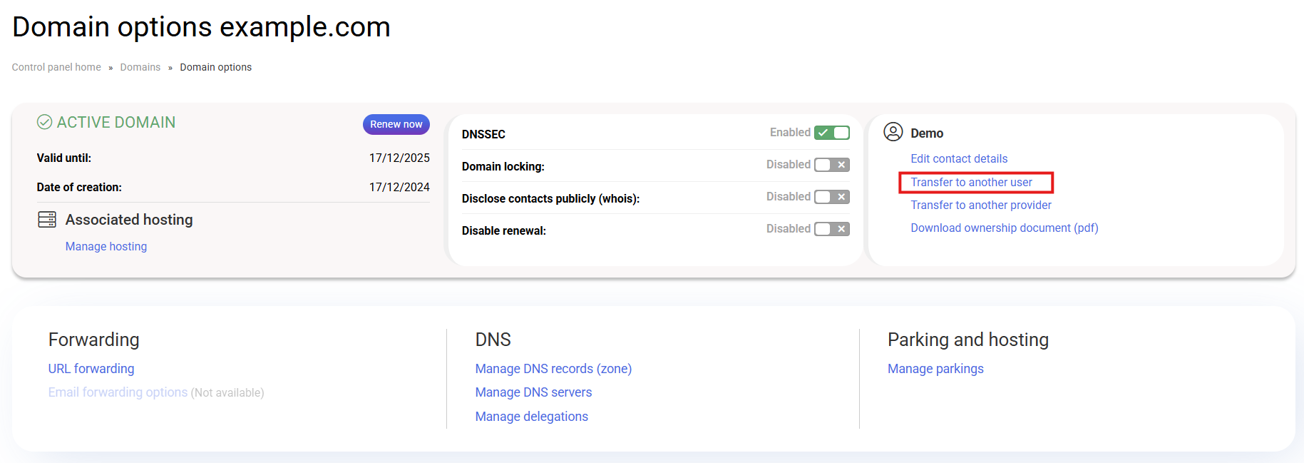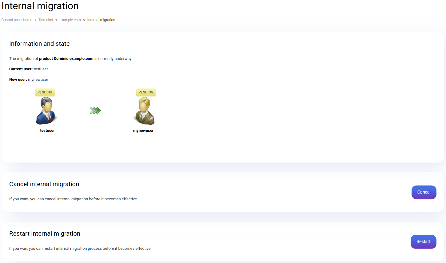 If you access the section to transfer the domain to another user again from the management of that domain, you can see the current status of the migration. You also have the option to cancel or restart the migration in case either of the two users has not received the acceptance email.