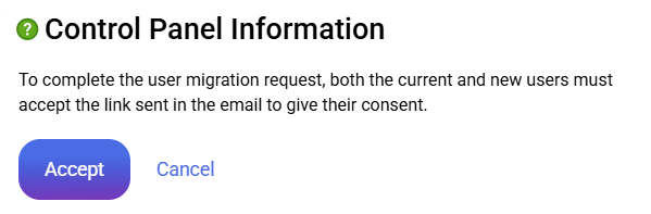 To complete the process, the migration request must be accepted by both parties, the current user and the new user. They will receive an email at their respective contact addresses.
