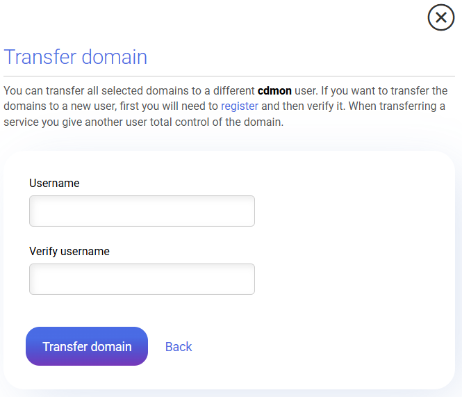 On this screen you must complete the fields Username and Verify username, entering the username (NOT the user’s email address) of the person to whom you want to transfer the domain. Once the username has been entered in both fields, click on Transfer domain, and the domain will be transferred automatically to the indicated user.