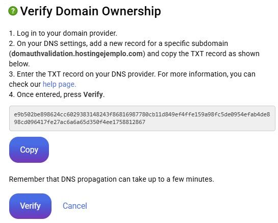 When the record has been created and propagated (you must leave several minutes/hours to spread) you will already be able to verify ownership of the domain. You must access the same window to verify the domain and click on the "Verify" button