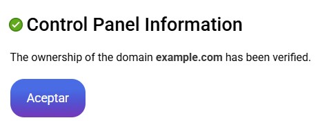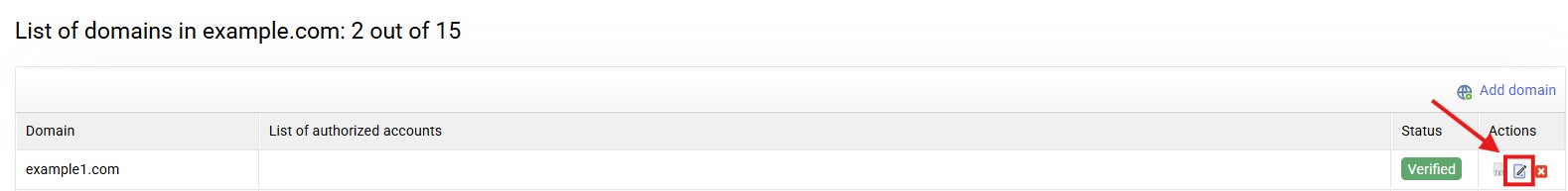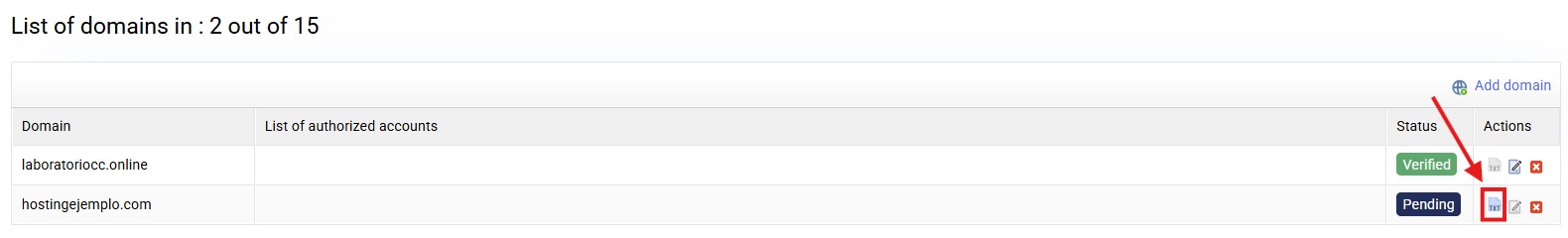Once you accept the message, we will return to the list of authorized domains and we will be able to see the domain that we have placed as pending validation. You can reopen the validation window if you have not copied it before, you must click on the logo in the "Actions" section: