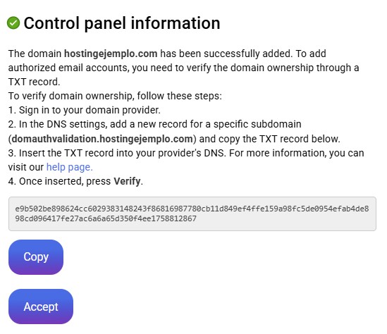 It will again open the window to verify domain ownership. Now is the time to do the process of creating a TXT record with the text that appears to it. You must do so in the DNS management of the external domain. How to set up a TXT record
