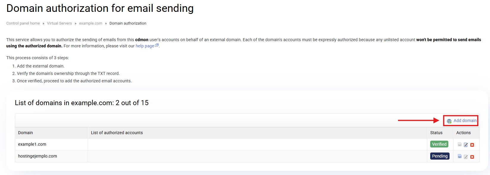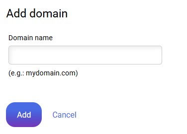 Upon accessing there will appear the list of domains already authorized or pending authorization in that hosting. To start the process you must go on "Add domain":