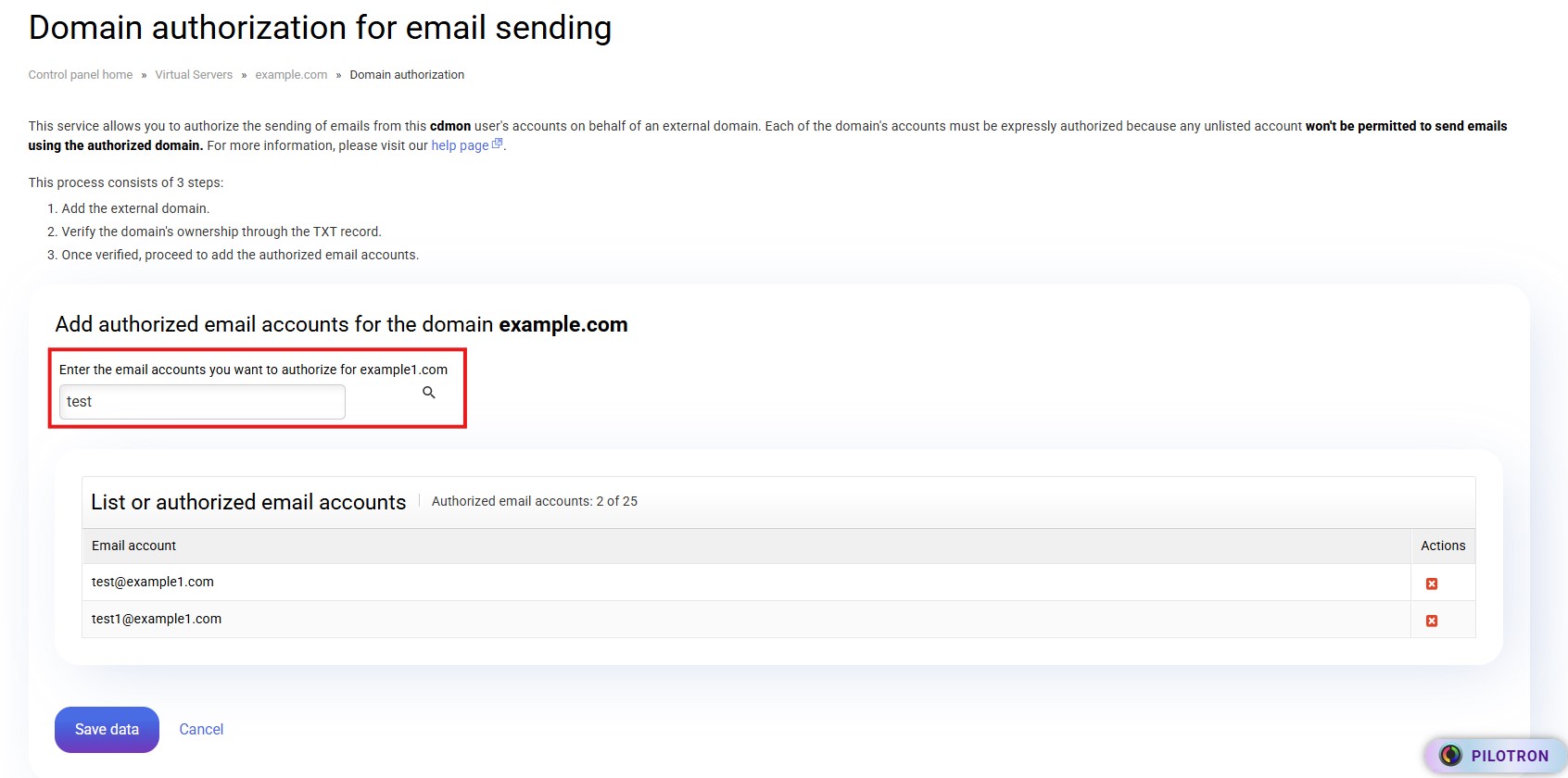 This allows you to authorize external domains that are not in your cdmon user so that they may be authorized to make these shipments. This guide shows how to access and manage domain authorization from the dashboard.
