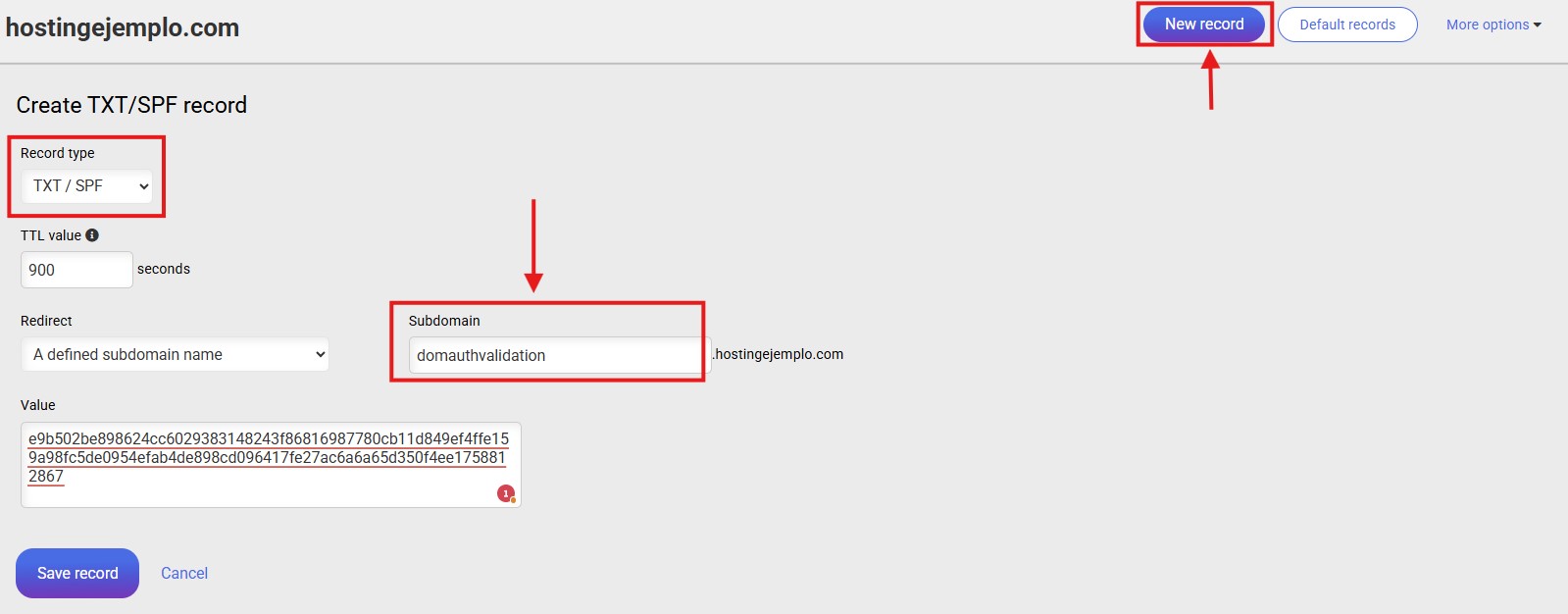 From here you can see all the DNS registers created in your domain. In this case you must click on "New Record" and you have to create a TXT record with the value that the dashboard has been copied in the previous step: