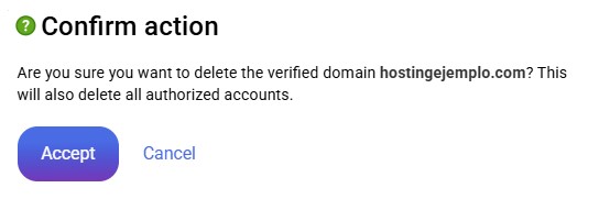 Finally, if you want to delete a list domain from those authorized to send mails from that hosting, you must only go to the list of domains and go to the action column to the last emoticon of all, the red cross. You must reaffirm that you wish to continue: