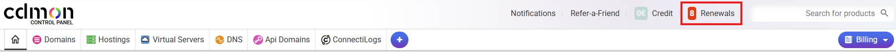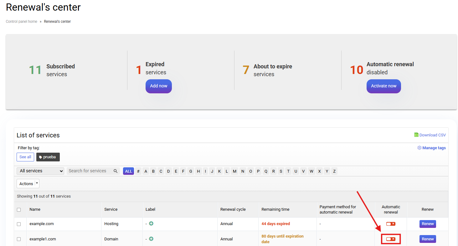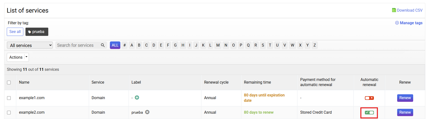 If you have money in the Balanceor you have the payment-by-card system active, you can enable automatic renewal. With this renewal method, domains will automatically be renewed fourteen days before the expiry date.