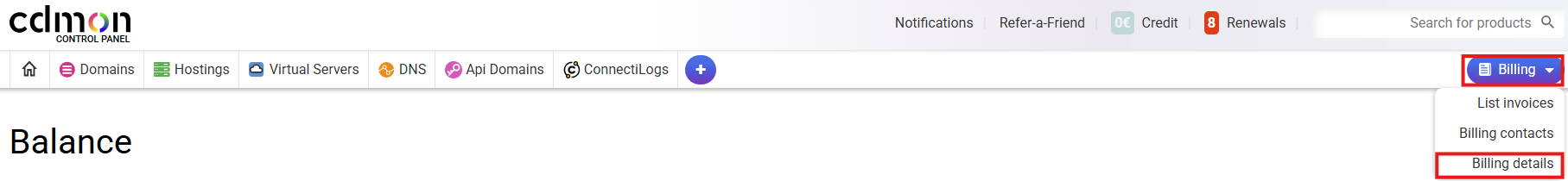 You can also add the balance without attempting to activate automatic renewal, so we must go to "Billing" and "Payment Control":