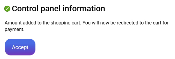 In giving you "Accept" another notification will appear to us indicating that the balance has been added to the cart, so we only need to go to it and proceed with payment. Just click on "OK" again: