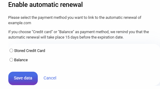 Enabling this option will appear a screen where you can choose the payment method for automatic domain renewal.