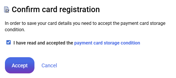 To continue with the process you must confirm the discharge of the card by reading and accepting the data storage conditions.