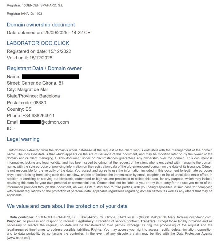 Clicking on that option will download a document such as the one you will see below, with the data in the Whois database at the time of issuance of the document, and in which you will be able to see the register, date.