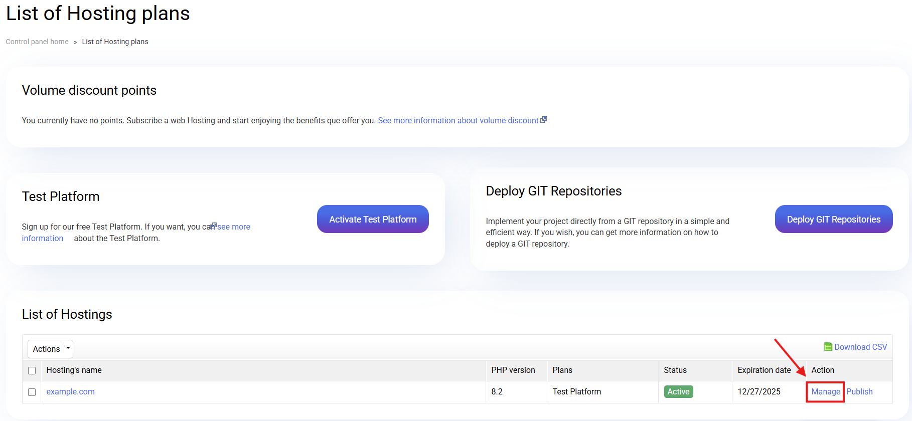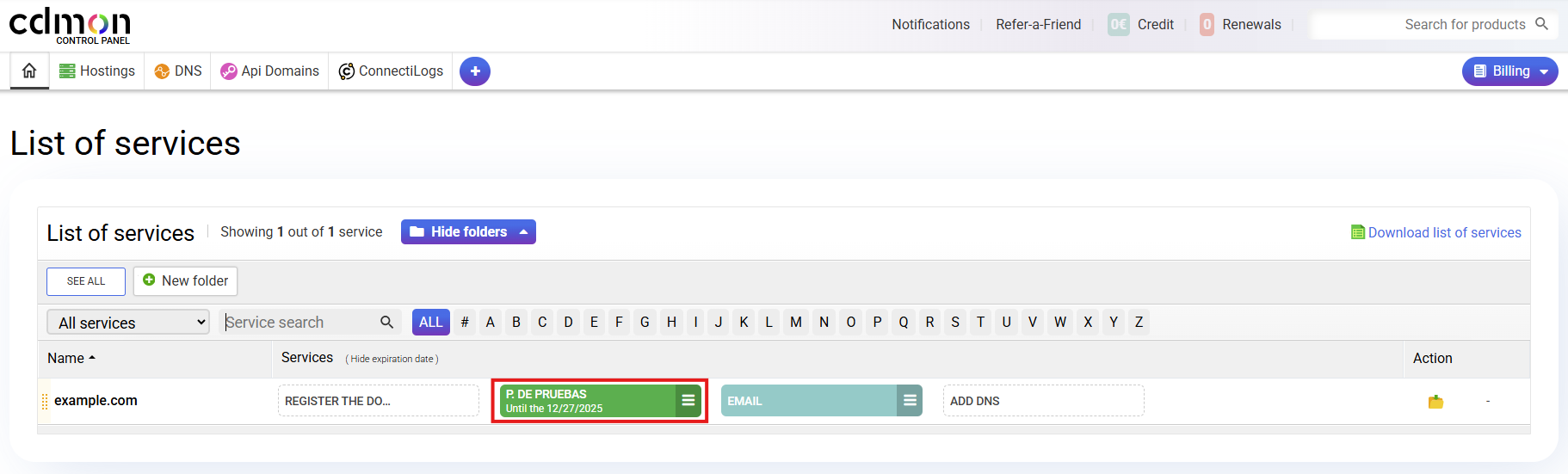 Access to the Test Platform is done just like access to any hosting, through the "Basic List of Services" or from the "List of Hosted Plans" in the cdmon Control Panel.