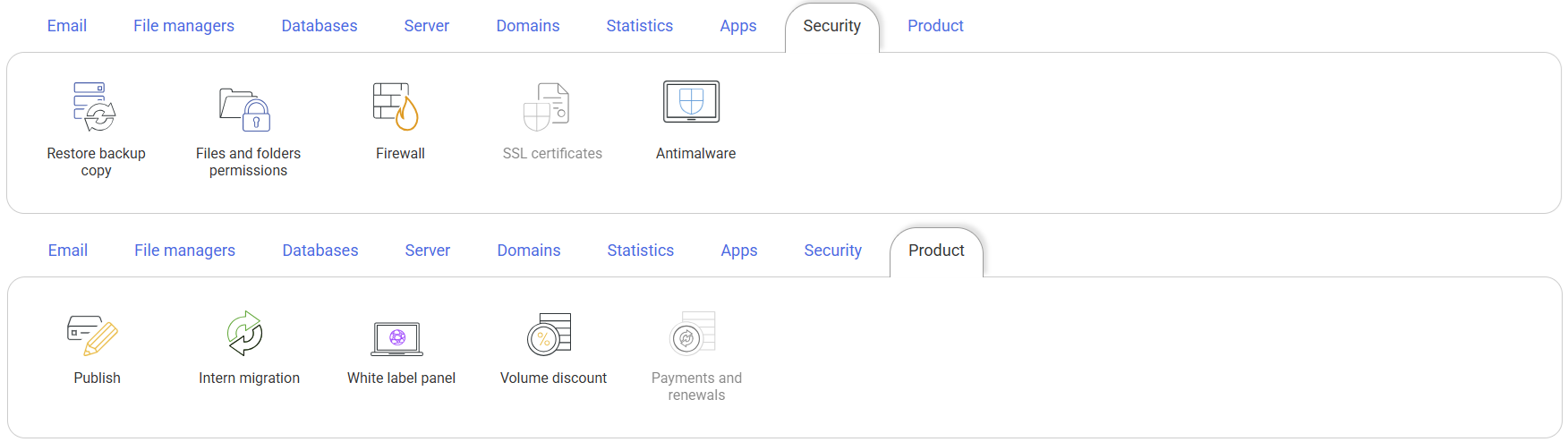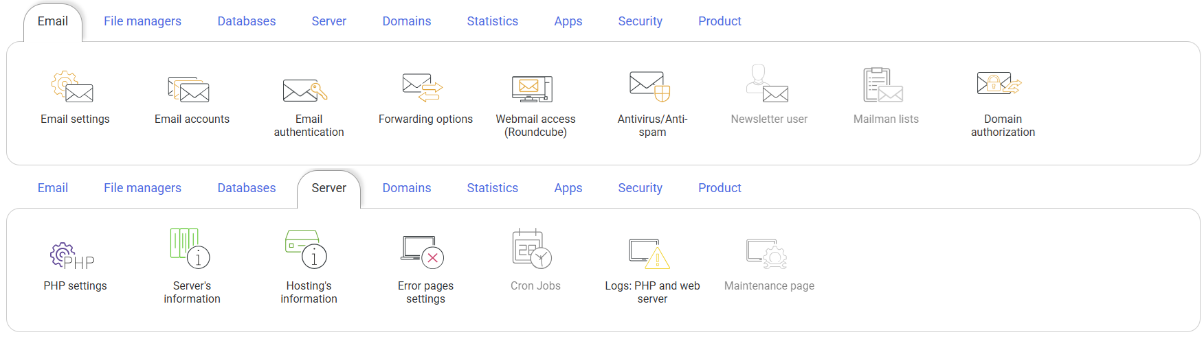 You can configure all the options in the hosting management panel, except gray, not active on the test platform: