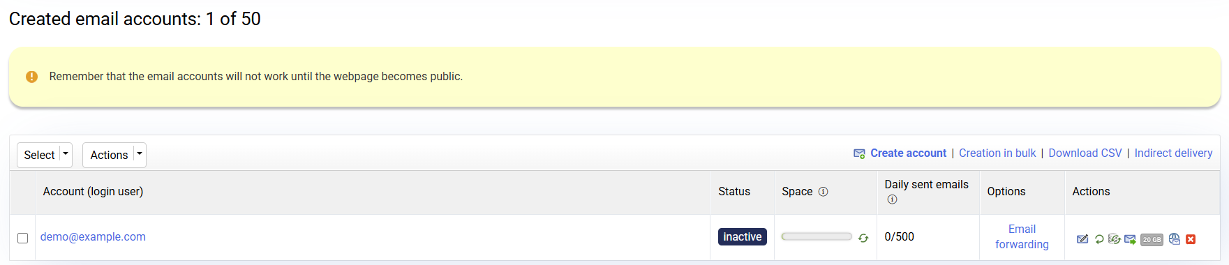 Just as the features of the Test Platform cannot be modified, email accounts cannot be activated, i.e. they can be created and configured but appear inactive until the moment you publish the web. Thus, when you hire a web hosting, the accounts will already appear active.