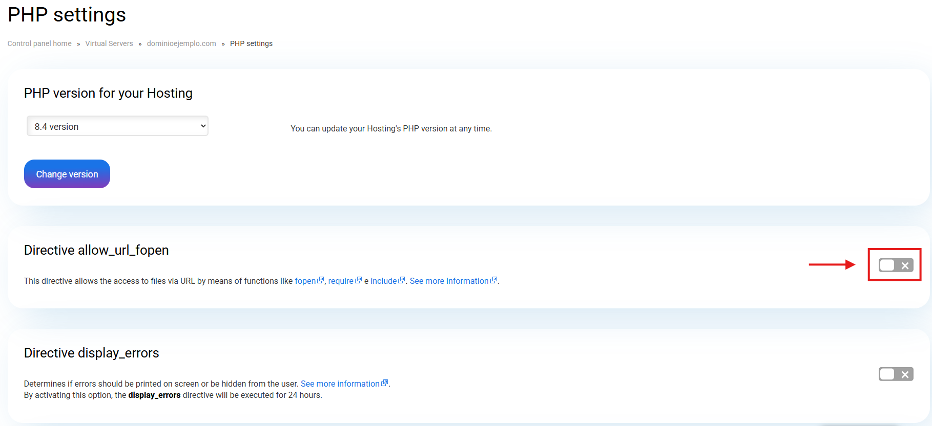 Once there, go to the "allow_url_fopen Directive" and verify that the toggle button in this column is enabled. If it appears as Disabled, click on it to enable it: