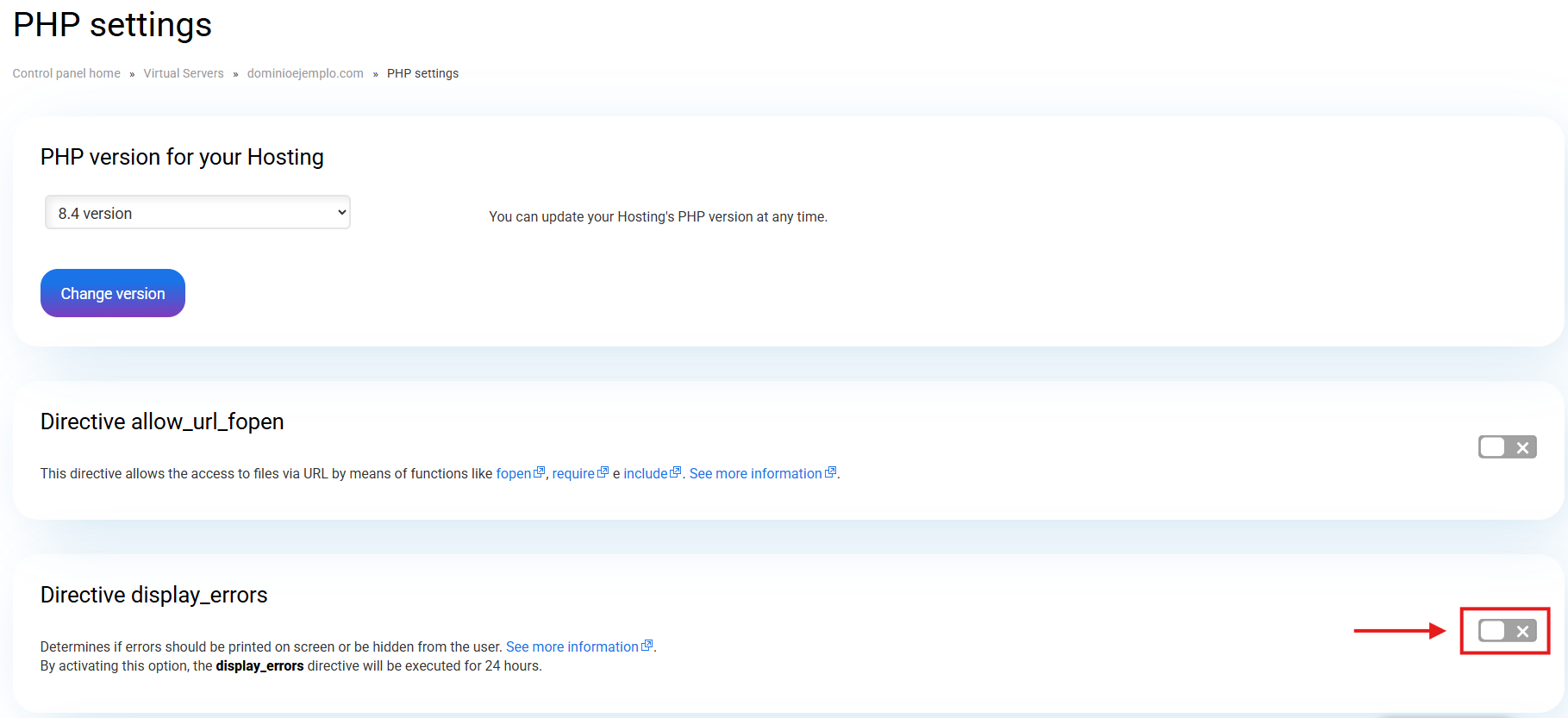 Once there, you need to go to the "display_errors Directive" and verify that the button in this column is enabled. If it appears as Disabled, you must click on it to activate it: