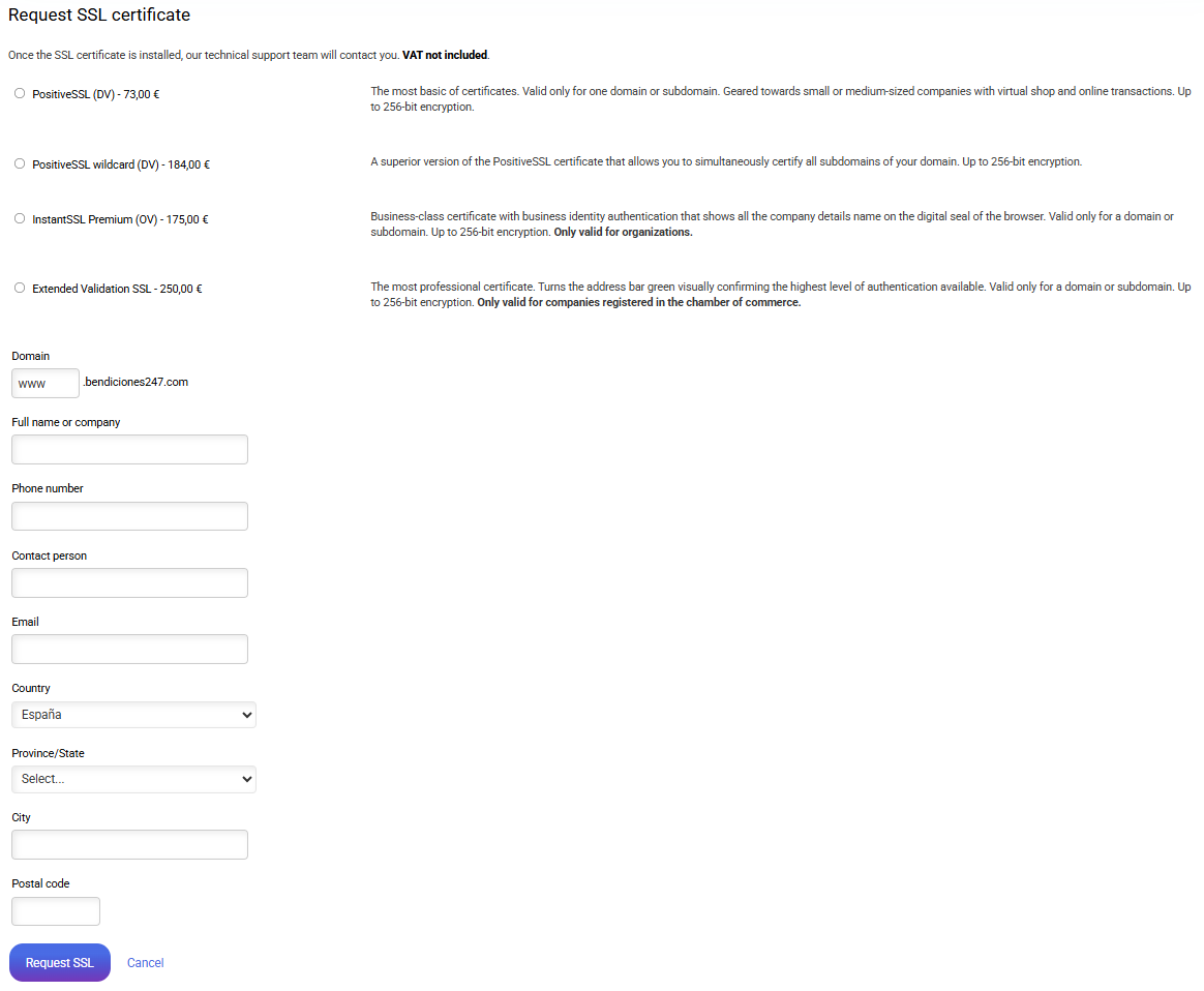 Select the SSL certificate that best suits you, complete the form, and click on Request SSL.