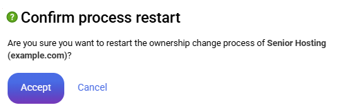 If for any reason you decide to restart the process, you can do so by clicking the Restart option in the “Restart ownership change” section. A confirmation panel will be displayed to approve the cancellation of the process.