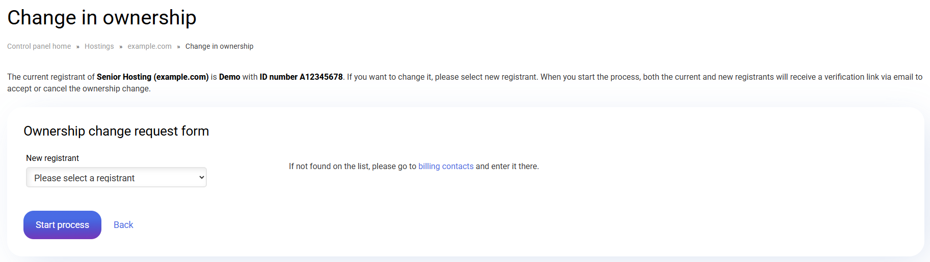 On the “Change owner” screen, you can select in the “New owner” dropdown the billing contact that will become the new owner of the service. If you do not yet have a billing contact created with the new owner’s details, on the same screen, to the right of the dropdown, you will find the “Billing contacts” option, which will take you to the form to create a new contact.