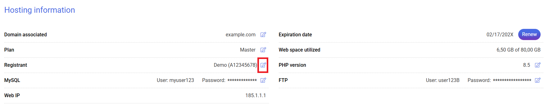 Access the management screen of the hosting, Virtual Up, dedicated server, or Multihost you want to modify and, in the “Hosting information” section, click on the “Owner” field and select the Change option.