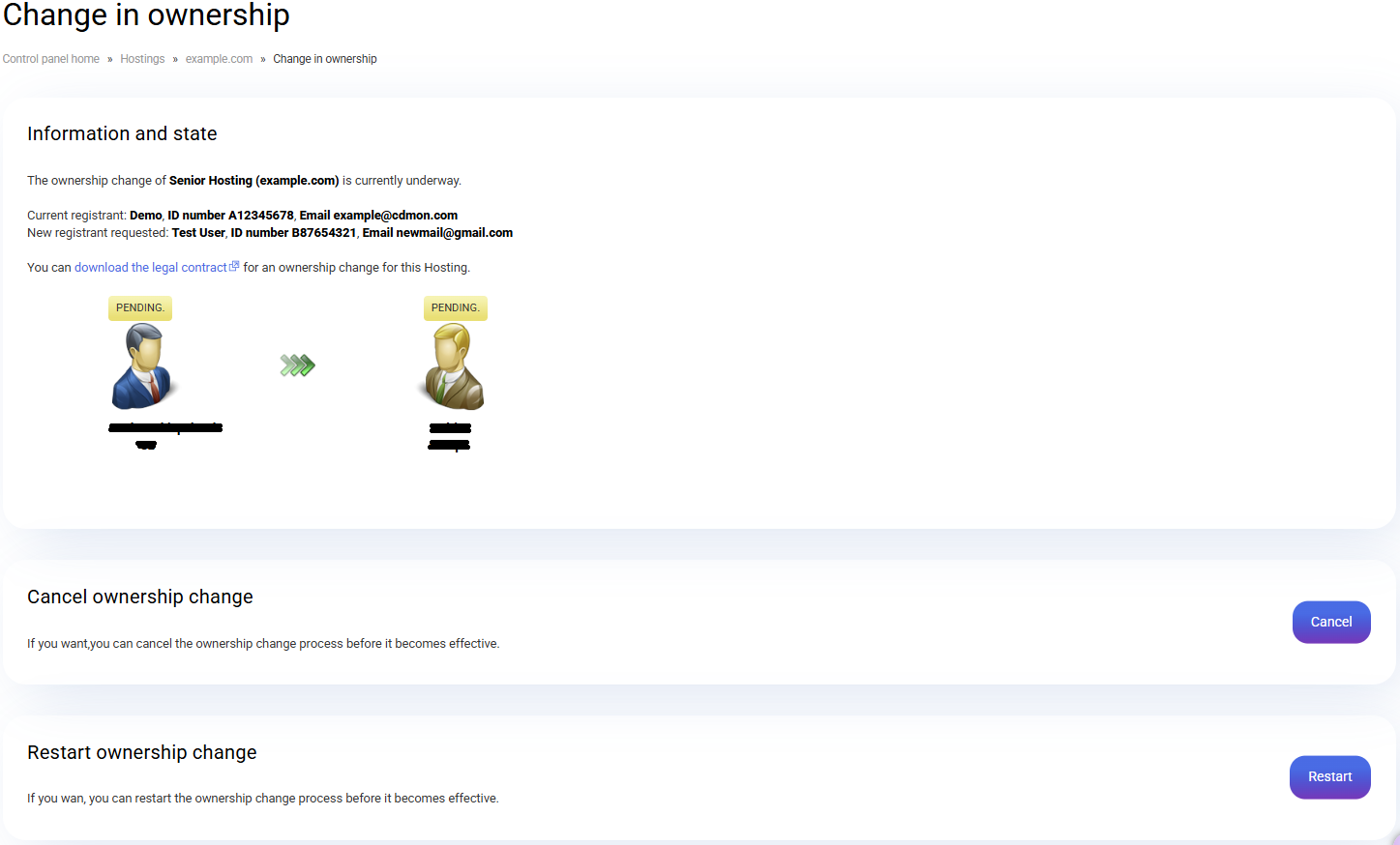 Two sections: “Cancel ownership change” and “Restart ownership change”.