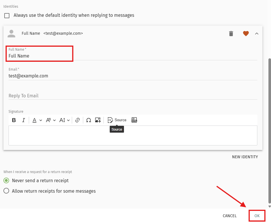 - Once the identity is expanded, you will see a form with the account fields. In the Full Name field, simply delete the text and enter the name you want to appear when sending emails (for example, your first and last name or your company name).