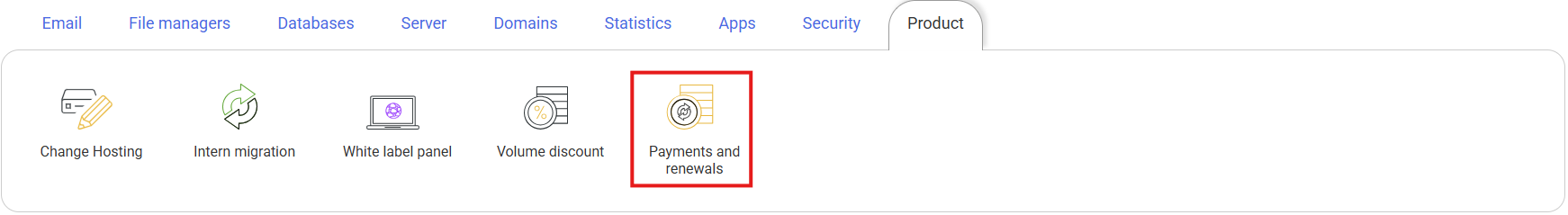 On the "Hosting management" screen, scroll down to the 'Product' section and click on the Charges and renewals option.