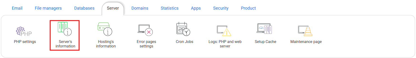 Access the hosting management from the control panel, look for the "Server" section, and select "Server Information.":