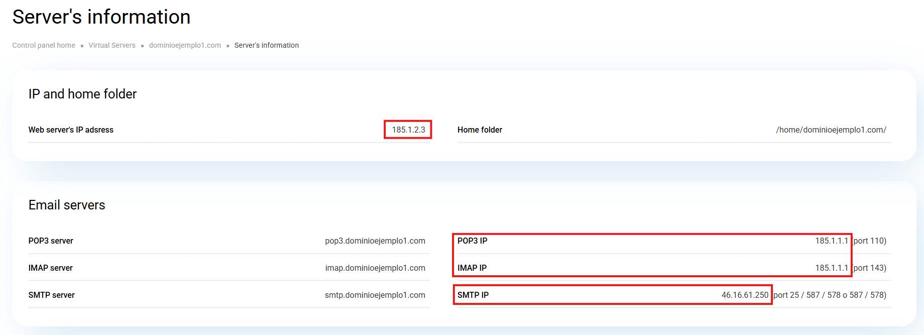 When accessing this window, on the left you will find the web server IP, and on the right, the incoming and outgoing mail IPs, which we have highlighted in this example screenshot: