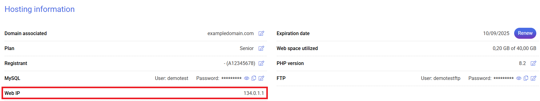 - In this section you will see the public IP assigned to your hosting. This is the value you must enter in “Hostname”.