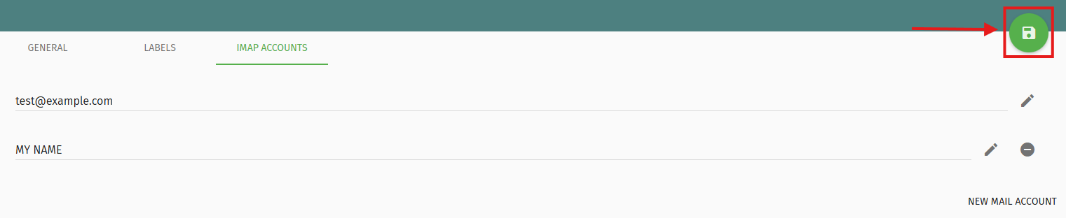 - After clicking OK, you will return to the IMAP accounts list. Click the green **SAVE CHANGES** button (top right corner) to apply the signature.