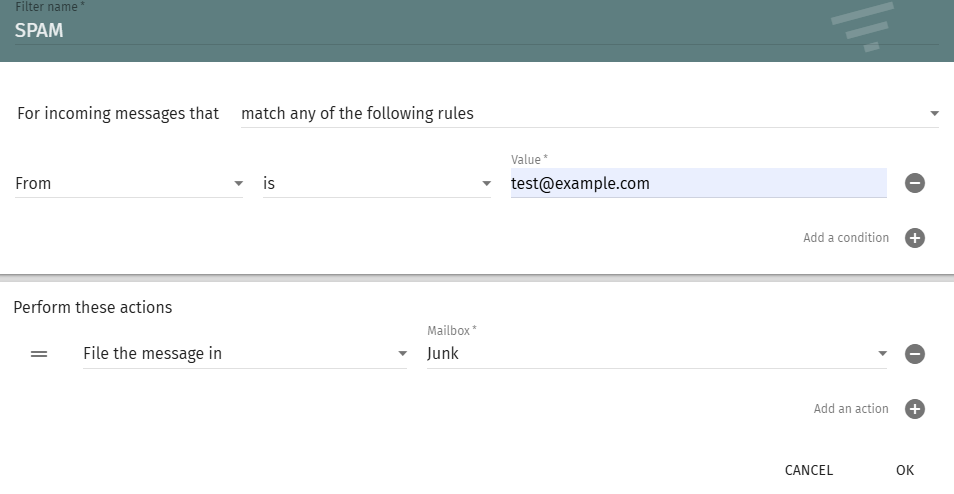 As an example, we will create a filter that moves messages to the Spam folder: