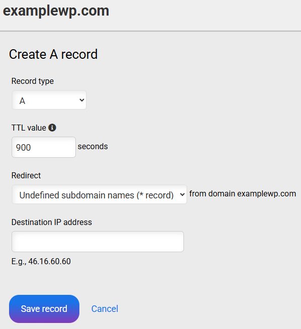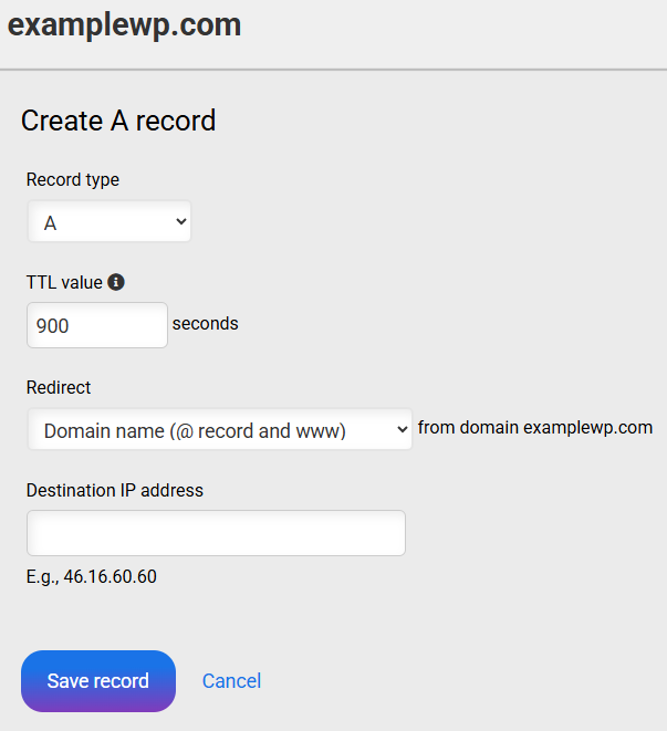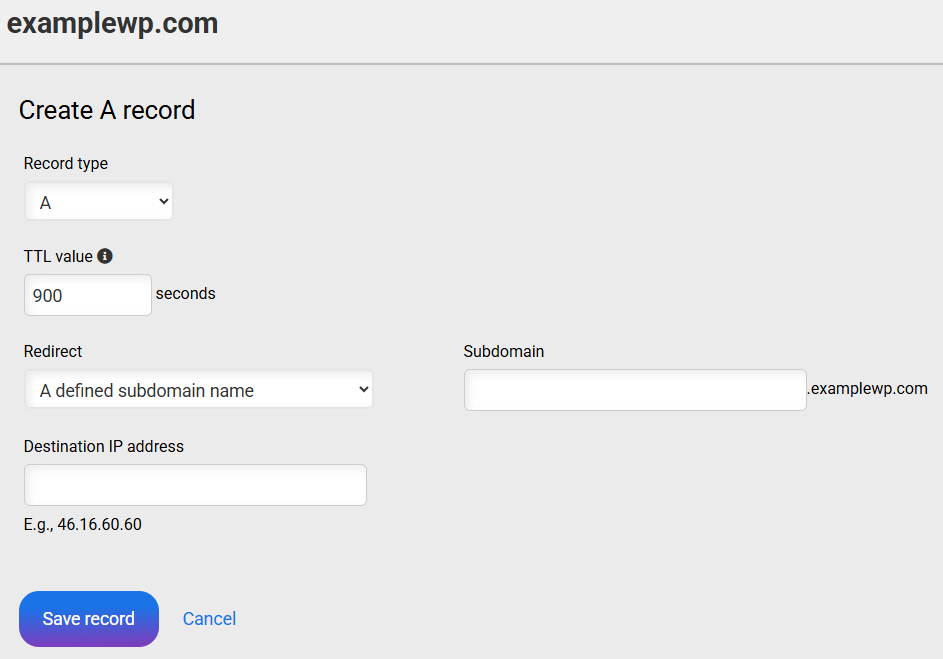 In the “DNS Records” list, click on New record and under “Record type” select the A record type.