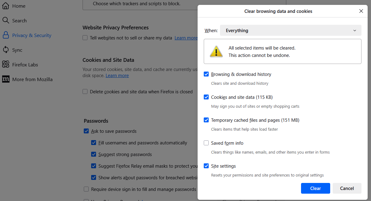 5. Once you have checked the Cached Web Content box, click Clear.