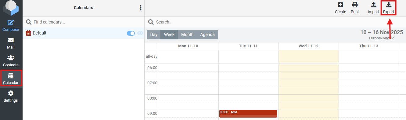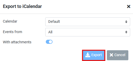 - Click the Export button at the top, and select the option Export all. A .ics file containing all your events and tasks for the selected days will be downloaded automatically.