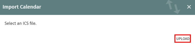 - A window will appear where you can select the file. Click the Upload button and select the .ics file exported previously from Roundcube.