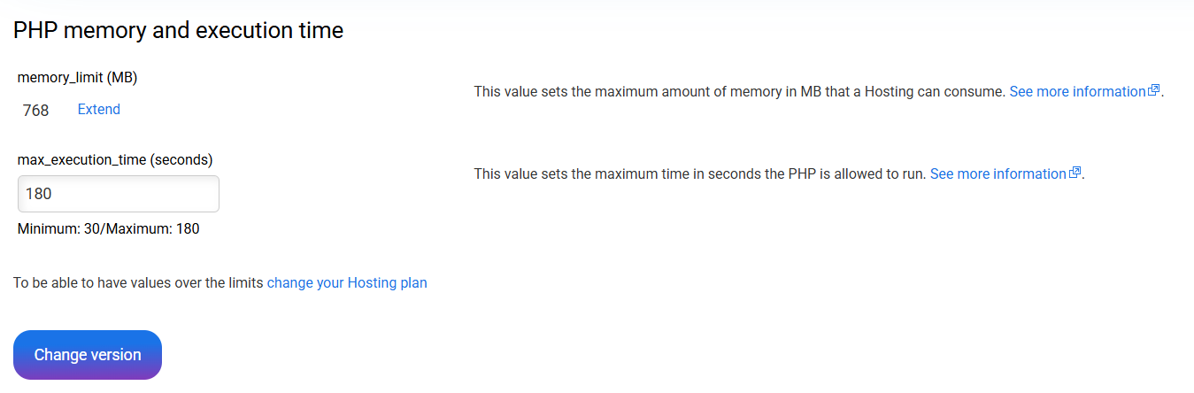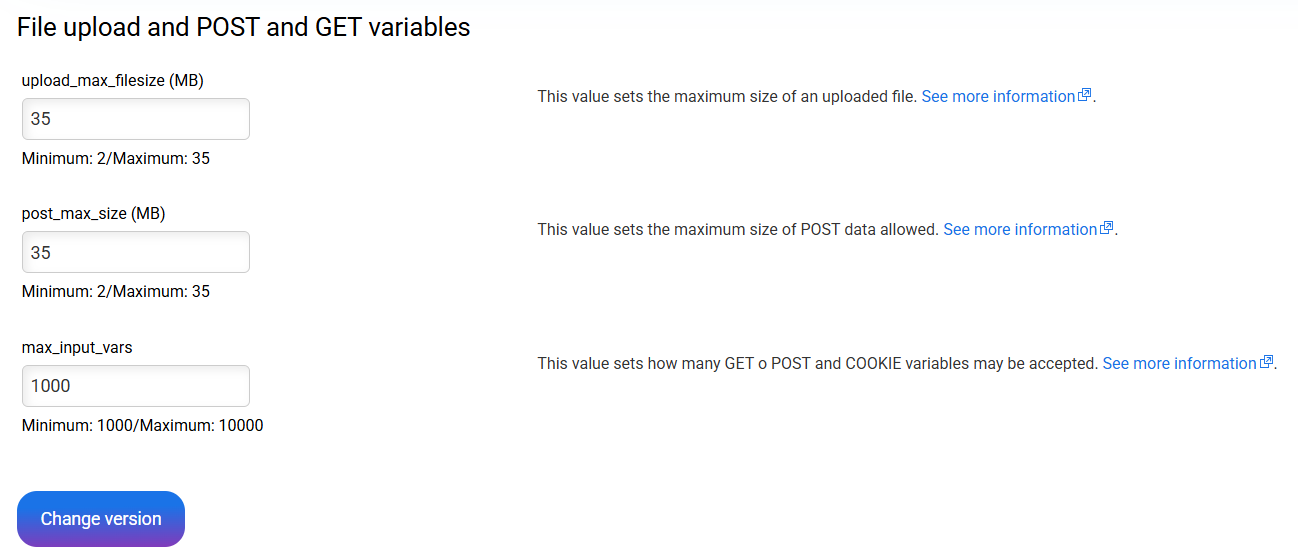 Within the advanced tools of the hosting service, you will find the option Configure PHP, where you can modify different PHP directives to adjust your hosting to the requirements requested by some CMS applications. These values vary depending on the ...