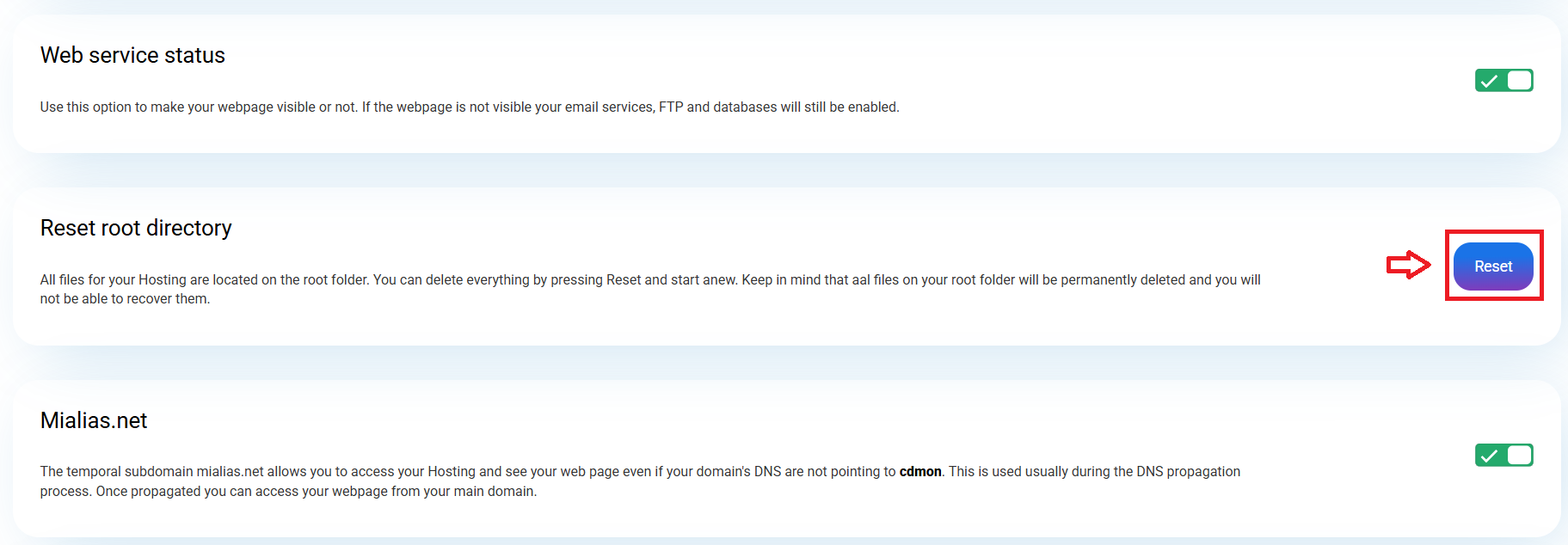 In the 'Hosting information' section, you will find different areas with information and actions related to hosting management. In the 'Reset hosting root folder' section, you must click on Reset.