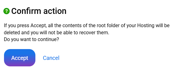 For security reasons, a confirmation window will appear. You must click on the Accept option if you wish to reset the hosting account.