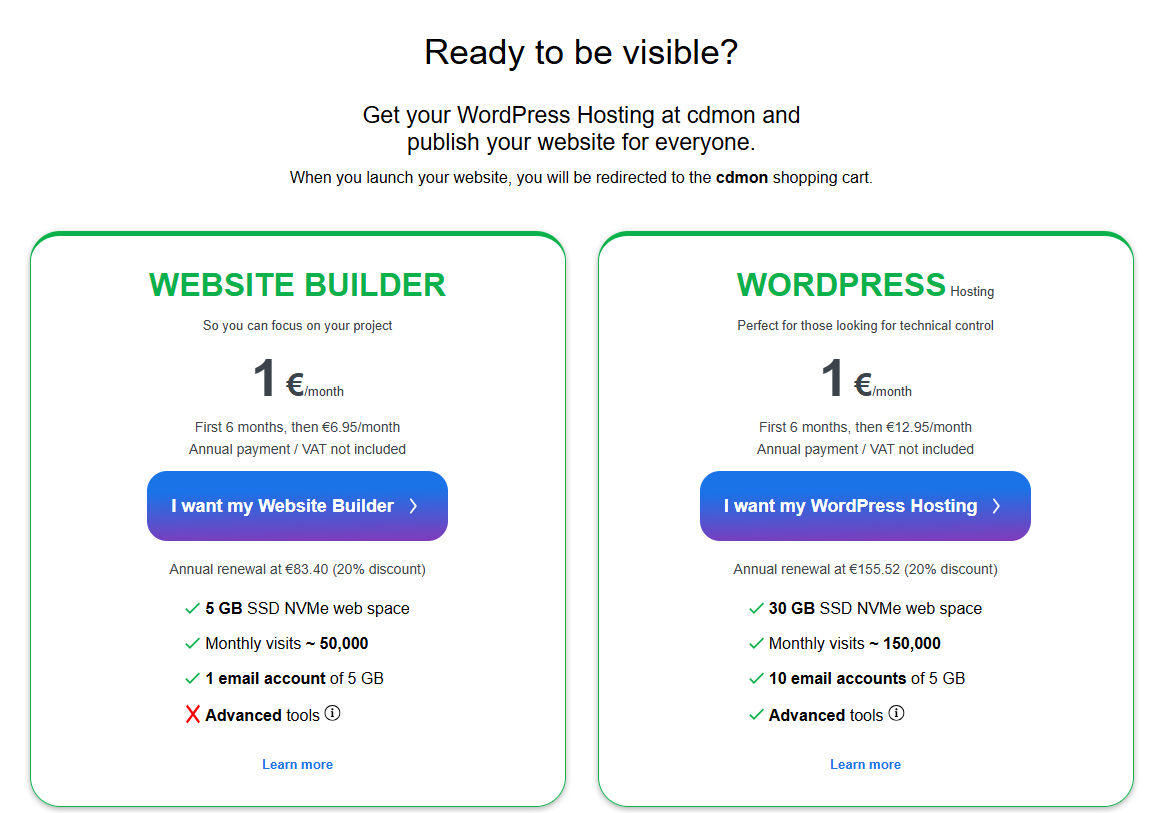 If you decide to purchase the hosting, click on Purchase and publish my website, which will redirect you to the purchase process on our commercial website.