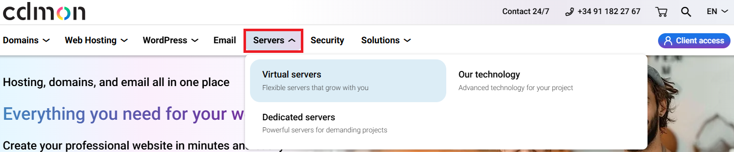 The first step to setting up a Virtual Server with us is to access our commercial website, cdmon.com. From this page, you can view all the information you need about our products and about cdmon. To purchase a new server, go to the upper-left section, under “Servers” and click on “Virtual Servers”: