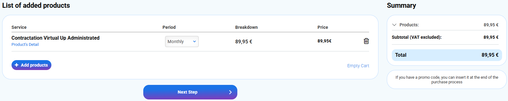 In the first step of the cart, you must verify the products you wish to pay for. If everything is correct, click on “Next step”: