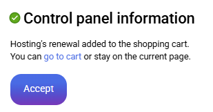 3.- When you click on the "Renew" option, the following message will appear, where you must click on go to the shopping cart to continue with the renewal or activation process of the hosting.